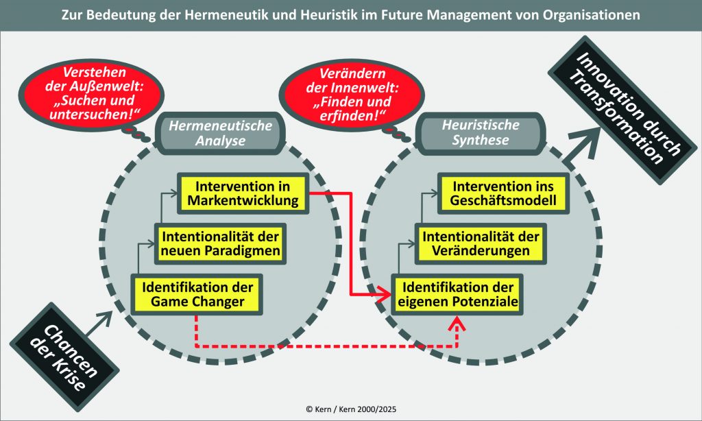 Das Verstehen der Außenwelt läuft unter dem Motto „Suchen und untersuchen!“. Es gilt, Anzeichen von Krisen zu suchen, die möglicherweise zur Bedrohung des Unternehmens werden können. Ebenso gilt es, die sich daraus ergebenden Chancen zu untersuchen. Der Begriff der Hermeneutik stammt aus der Philosophie und meint die reflektierende Interpretation von dem, was dem Menschen an Zeichen und Symbolen, an Texten und Begriffen dargeboten wird. Wer das macht, gewinnt allmählich einen Eindruck, an welchen Stellen in der Innenwelt der Organisation nachjustiert oder angepasst werden muss.