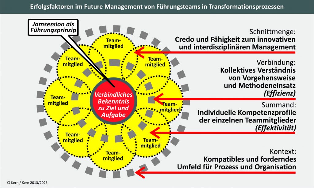 Jamsession würde bedeuten: Es gibt keine Alphatiere, keine Egos, die sich in den Vordergrund schieben, kein stures Festhalten an alten Routinen. Stattdessen gibt es ein kongeniales Zusammenspiel: Exzellenz, im eigenen Fachgebiet gehört das einzelne Mitglied des Führungsteams zu den Besten; Ehrgeiz, jeder will immer das Maximum an Lösung aus einem Problem herausholen; Egalité, das Ego verhält sich wie ein Gleicher unter Gleichen. Alle sind kreativ, weil Transformation die Improvisation braucht. Ihre Prioritäten sind sachorientiert, nie persönlich motiviert. Sie wissen, dass sie Teil einer Problemlösungskompetenz sind, die nur zusammen zur Geltung kommt – das Führungsteam ist der Star!