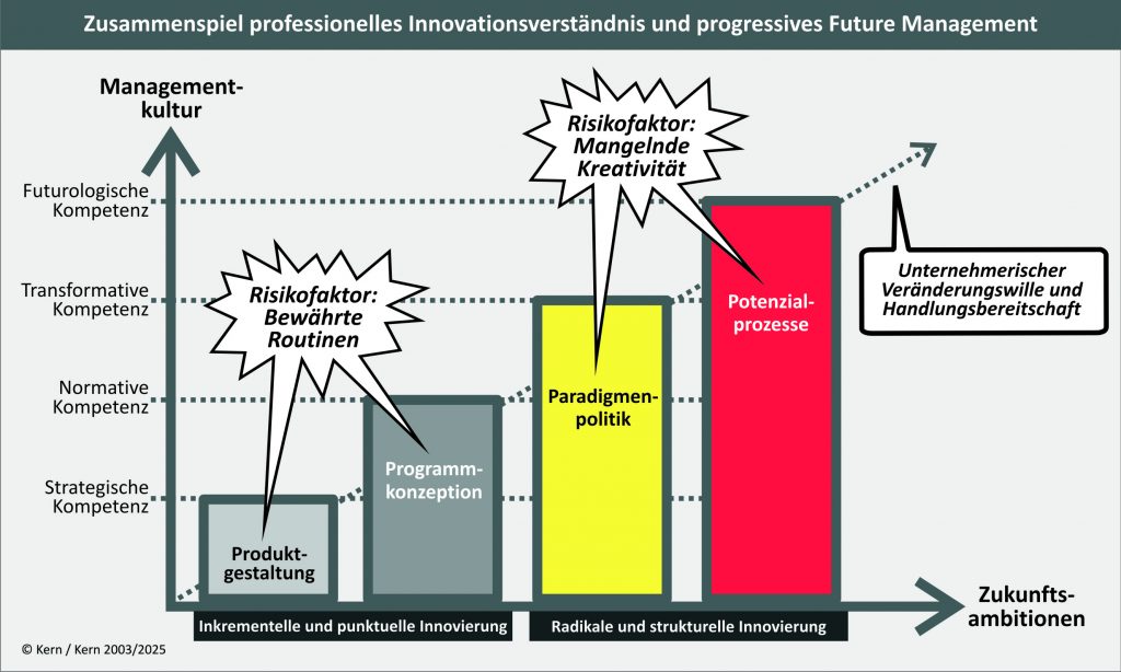 Konkret: Es braucht ein hohes Maß an Zukunftsambitionen, um als Wirtschaft aus unternehmerischem Veränderungswillen in den Modus der Handlungsbereitschaft zu kommen. Wie das Beispiel Wero zeigt, braucht es auch mindestens den europäischen Konsens, in diesem Fall aller Banken, um ein ernst zu nehmender Wettbewerber, hier für Paypal, zu werden. Das übliche Kleinklein und nationales Gezicke müssen der Vergangenheit angehören, andernfalls … Es ist kein Geheimnis mehr, dass Deutschland Europa braucht und auch umgekehrt. Und es ist auch keine neue Erkenntnis, dass die Kleinen die Großen (wie auch umgekehrt) brauchen. Warum? Weil sich die Alchimisten-Küche der Innovatoren nicht mehr nur in Konzernstrukturen, sondern auch in KMU’s und Start-up’s abspielt. Es braucht unendlich viele kleine Potenzialprozesse, um tatsächlich radikal und strukturell zu innovieren. Wer dies tut, merkt sehr rasch, dass es weniger um neue Produkte und Programme geht, weil das gängiges Alltagsgeschäft ist. Es geht vielmehr um die Potenziale der Organisation bzw. des Unternehmens. Die zukünftige Managementkultur zeichnet sich am oberen Ende der Kompetenzskala durch eine futurologische Komponente aus. Zukunft von Unternehmen wird nicht durch Produkte, sondern durch produktive Potenziale gemacht.