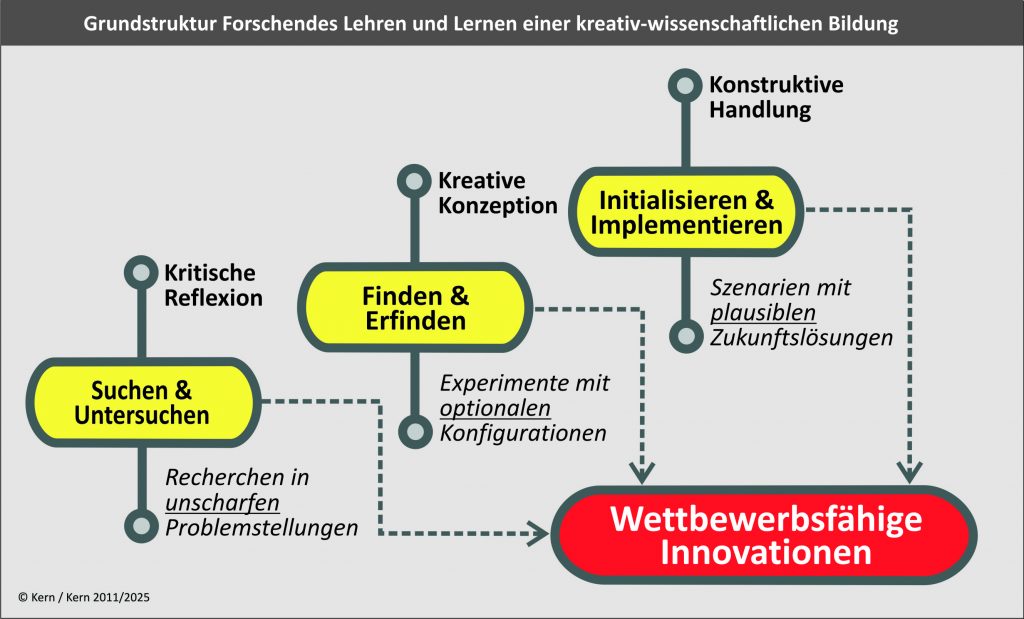 Wer die Erneuerung der Wirtschaft will, braucht gestaltungskräftige Innovatoren, die an Zukunftslösungen forschen. Kreativ-wissenschaftliche Bildung darf nicht mehr Orchideenfall an Hochschulen sein, sondern selbstverständliche Prämisse für Innovation. Sie muss essenzieller Teil der Curricula werden. Es braucht die kritische Reflexion und das heißt Suchen und Untersuchen unscharfer, komplexer Probleme. Es braucht kreative Konzeptionen und das heißt Finden und Erfinden, auch mit Hilfe von Experimenten. Es braucht die konstruktive Handlung und das heißt Initialisieren und Implementieren von Szenarien.