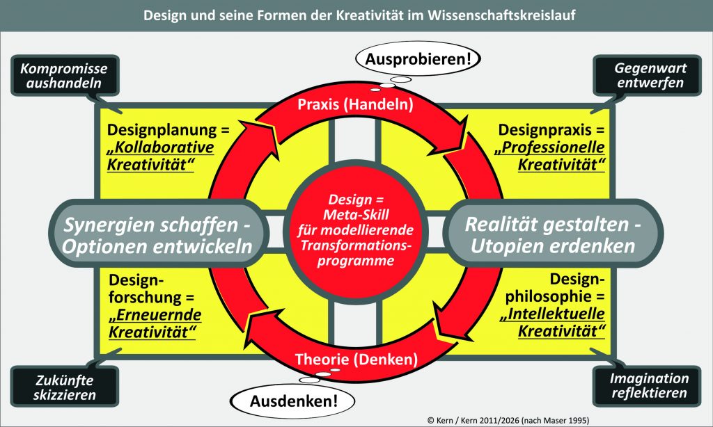 Als Wissenschaftler und Lehrer begeistere ich mich für historische Meilensteine in der Kreativität, aber vor allem interessiert mich die Rolle der Kreativität als wesentlicher Treiber der Zukunftsgestaltung. So lässt sich heute immer deutlicher erkennen, „Kreativität ist … in sehr vielen Berufen relevant …“ – siehe „Diese Jobs wird KI nicht ersetzen“ (6.4.2026, handelsblatt.com). Zukunftsfähig sind „Auch Berufe, in denen es um komplexe Problemlösungen geht …“. Womit wir bei einem holistischen Verständnis von Design sind, das seine Kernkompetenz in der Kreativität sieht und seine Wirkung durch komplexe Problemlösungskompetenz zeigt. Eine erratische Welt erfordert immer mehr Menschen, die in ihrem Denken (und Handeln) schnell und flexibel agieren und reagieren können.